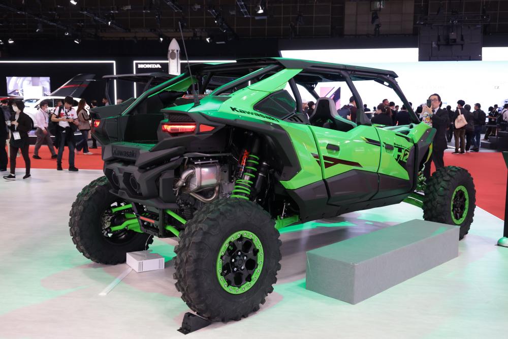 Kawasaki's flagship high-performance sport side x side features a model-specific 999 cm³ In-Line Four supercharged engine—a modified version of the Ninja H2's supercharged engine optimised for side x side use—mounted in a newly designed chassis. It efficiently puts its substantial 250 hp output to the ground via a continuously variable transmission (CVT). A wide stance, long wheelbase, large 33” tyres, and high-performance suspension provide the chassis with exceptional control and stability. Inside the spacious cabin, high-backed seats with 4-point seatbelts offer excellent hold performance during sporty driving.