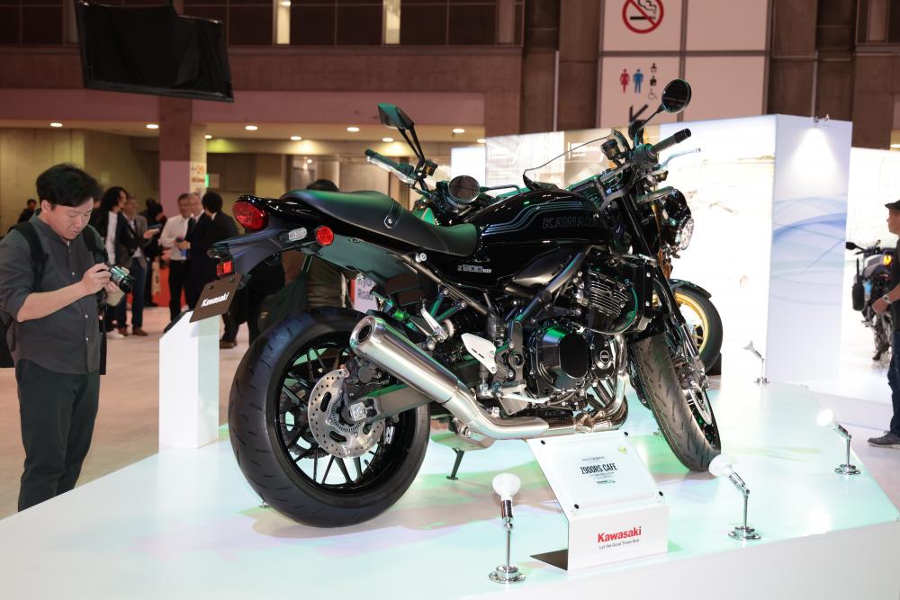 The Z900RS CAFE combines a front cowl inspired by legendary superbike race machines of the past with drop-style handlebars and a stepped seat unique to this model. The only graphics, which have a direct connection to the rainbow stripes used on Kawasaki's legendary Mach series, are found on the fuel tank, lending the machine a simple, sporty look. It also features a unique “KAWASAKI” heritage logo, a high-quality silencer with hairline finish and short mirrors, creating an image distinct from the standard model, while its race-inspired riding position and classic styling further differentiate the ride feel and owner experience.