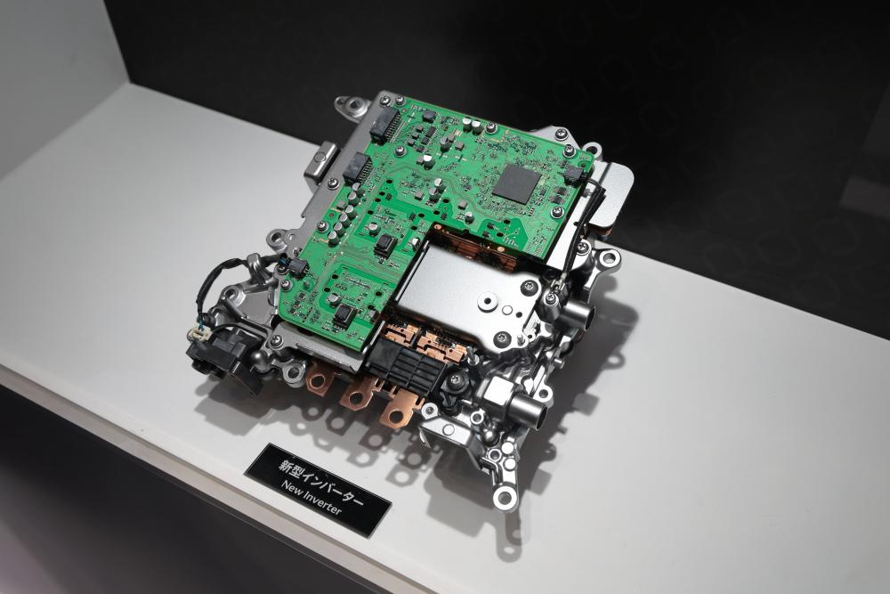 An inverter converts direct current (DC) from the battery into alternating current (AC). This inverter leverages SiC (Silicon Carbide) power semiconductors in the power cards that perform current conversion.