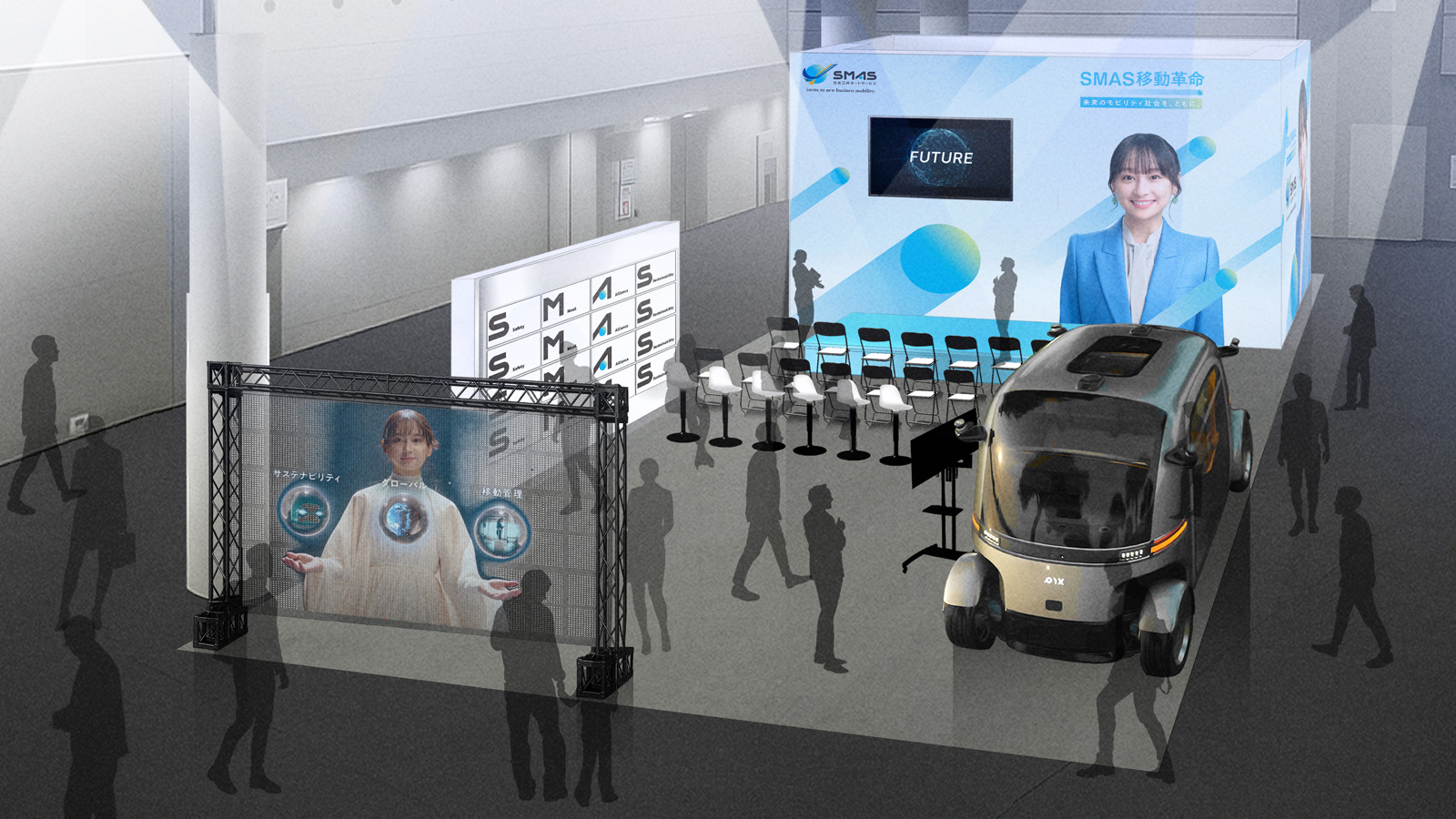 SMAS is a leading company in the car leasing industry, driving social transformation through initiatives in EVs, digital transformation (DX), and global expansion. As a “Mobility Platformer for Sustainable Society,” SMAS creates new value by connecting people, businesses, and communities while responding to diverse mobility needs. At the SMAS booth, visitors will explore future mobility concepts under four themes — Safety, MaaS, Alliance, and Sustainability. A large multi-screen installation, “FUTURE VISION,” features news anchor Yuka Kageyama presenting “SMAS FUTURE NEWS,” offering an immersive look into the present and future of the SMAS Mobility Revolution. The booth also showcases ROBOBUS (PIX Moving), an autonomous bus adopted by BOLDLY Inc., which is tackling local transportation challenges.