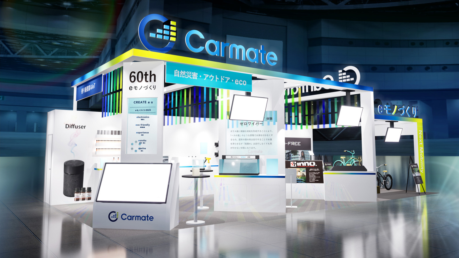 「カーメイトと共に彩る Mobility Life」をテーマに、新型の特定小型原動機付自転車「e-FREE(イーフリー)」や、雨がつかない超撥水フィルム、最新の噴霧式フレグランスディフューザーを展示。また、カーキャリアのINNO(イノー)からは防災対策を兼ねたアウトドア・レジャー用品、香りとIoTを融合させた新技術、iPhone標準アプリを活用したセキュリティアイテムなど、暮らしに寄り添う多彩な新提案を行います。さらに、業務用車両やトラック向けのBtoBサービスも紹介。創立60周年を迎えるにあたり、沿革に触れつつ当社の総合力と、未来を見据えた取り組みをご紹介いたします。