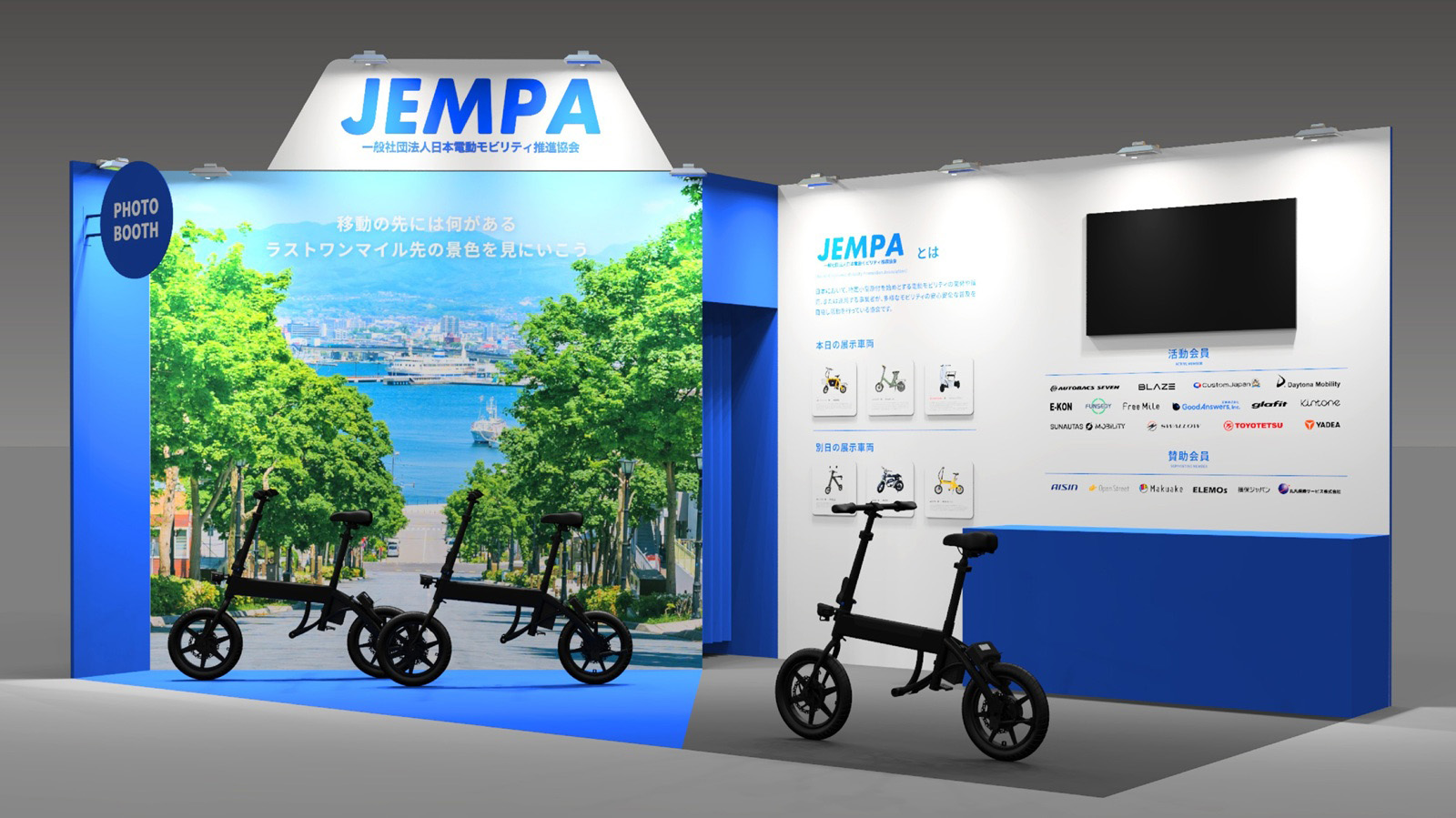 ブースでは、16歳以上免許不要でお乗りいただける「特定小型原動機付自転車」の最新モデルをご覧いただけるとともに、フォトブースでお好きなモビリティに乗ってお写真をお撮りいただけます。